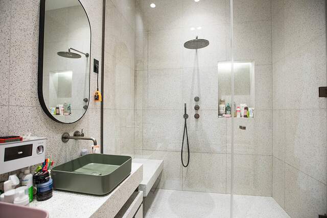 The apartment has a living room, dining room with open kitchen, five bedrooms, bathroom, three showers, dressing room, utility room, hallway, two toilets, and entrance hall.