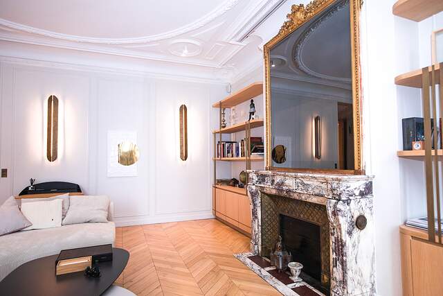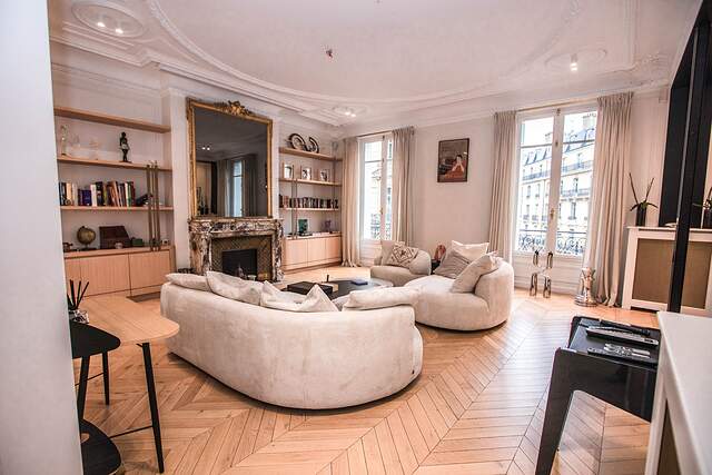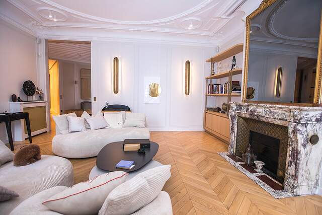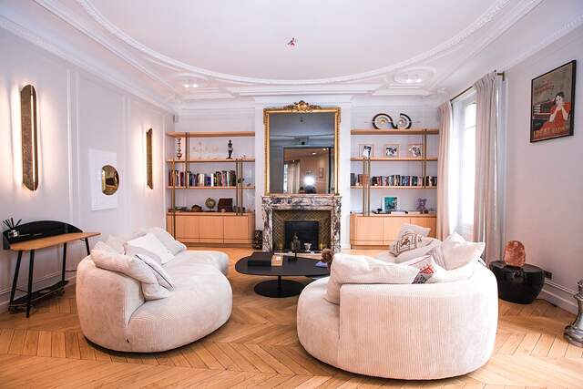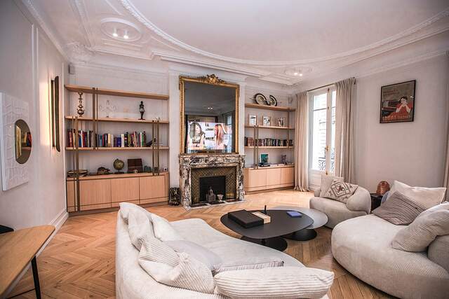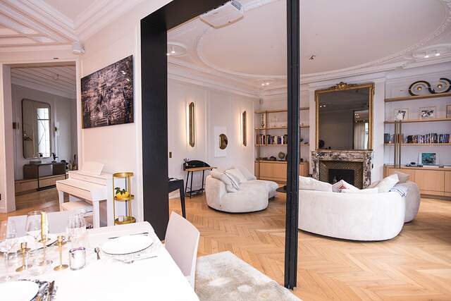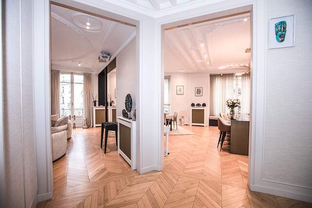 It's a classic Haussmannian style apartment with parquet flooring and high ceiling with decorations.